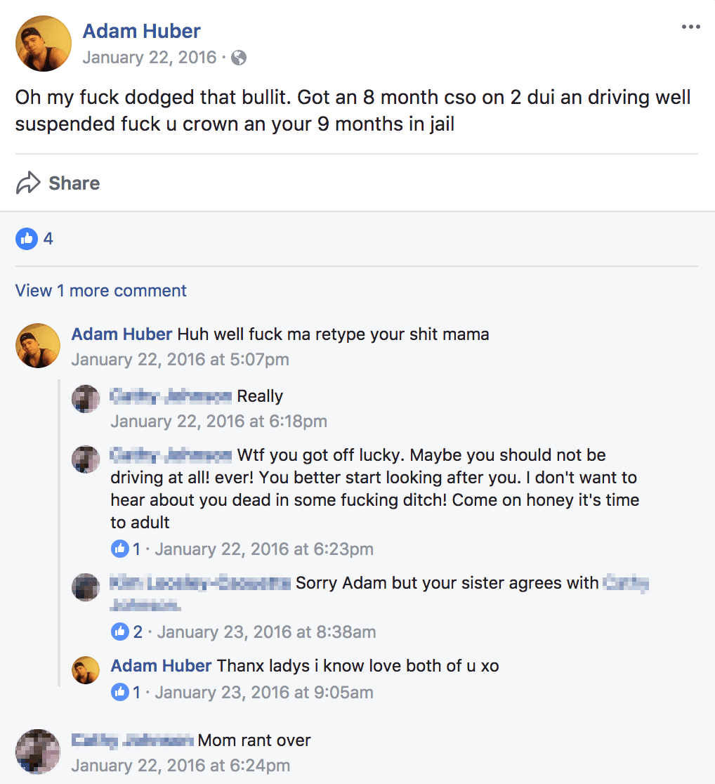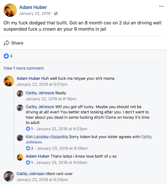- Adam Huber - One day in jail and 12 months probation. He must also go into treatment for his alcohol problem.