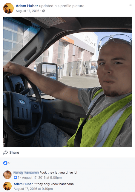 In one instance, police witnessed Huber blow through two stops signs. Other witnesses also saw him stumble in and out of his truck. He later left his truck, where police found his wallet and a near empty bottle of whiskey. Adam Huber was arrested a short time later in a nearby dul de sac.